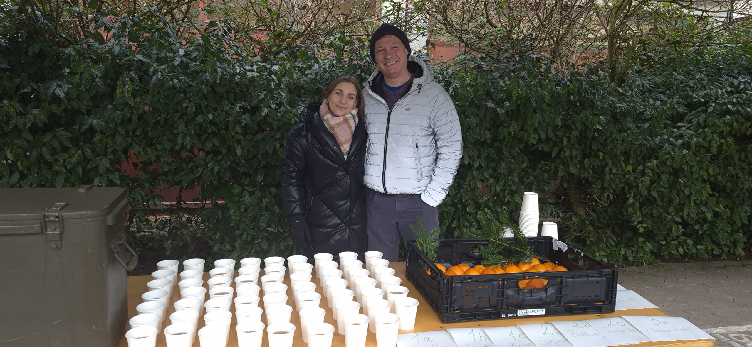 Am 02.12.2025 fand im Rahmen des ersten Adventssingens die stimmungsvolle Clementinen-Verteilaktion des Elternrats statt. Nach den berührenden Liedern der Kinder durften sich alle Teilnehmenden über ein warmes, verzaubertes Getränk freuen. Der feine Duft von aromatischem Kräutertee, verfeinert mit einem Hauch zuckerfreien Sirups, lag in der Luft und schuf eine wohltuende, adventliche Atmosphäre.